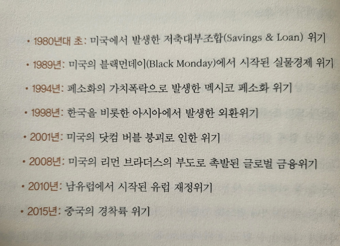 이 목록을 보면 위기가 거의 주기적으로 발생함을 알 수 있습니다. 그렇다면 그 원인은 무엇일까요? 위기마다의 원인은 다르겠지만 크게 공통점인 원인이 있었습니다.