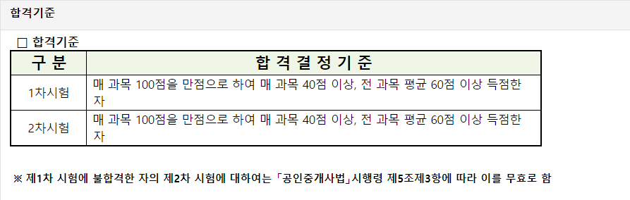 모든 과목이 40점을 넘겨야하며, 과목 평균 점수가 60점이상이면 합격입니다.