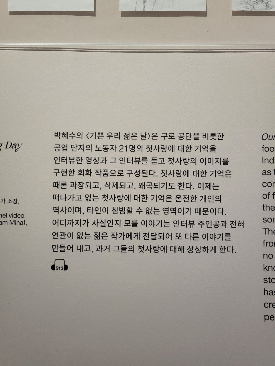 이번 미술관 중에 제일 좋았던 부분이에요. 21명의 노동자들에 첫사랑을 인터뷰를 해서 그것을 그림으로 표현한 작품들인데요. 모두가 가지고 있는 첫사랑에 대한 부분을 한명씩 인터뷰하면서 그것을 회상하는 부분이 모두가 가지고 있는 공통정이지 않을까 생각이 들었습니다.
