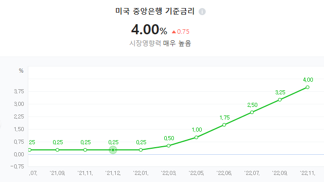 22.11.03일 미국 금리가 무려 0.75%의 빅스텝을 강행했습니다. 불과 10개월전 0.25%(22.01)을 비교하면