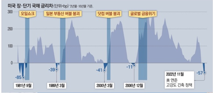 하지만 갑작스런 인플레이션과 물가인상이 높은 상승률을 보이면 단기채권의 금리가 장기채권의 금리를 역전하는 현상이 일어납니다. 위 사진을 보시다시피 세계경제의 큰 사건이 일어날때마다 장-단기 채권이 역전된 것이 보이시나요?