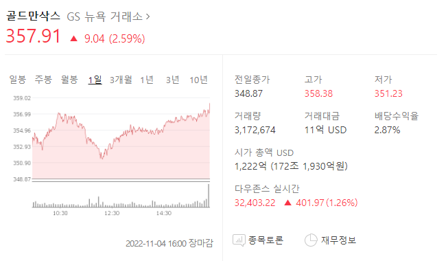 처음 사진을 보시다시피 시진핑 주석이 공식 석상에서 마스크를 쓰지 않은 모습을 볼 수 있죠. 이로인해 제로코로나 정책이 완화 될꺼라는 전망이 보이면서, 11월 4일 골드만삭스(중국종합증권)가 2.59% 상승장으로 마감한 것을 확인할 수 있었죠.