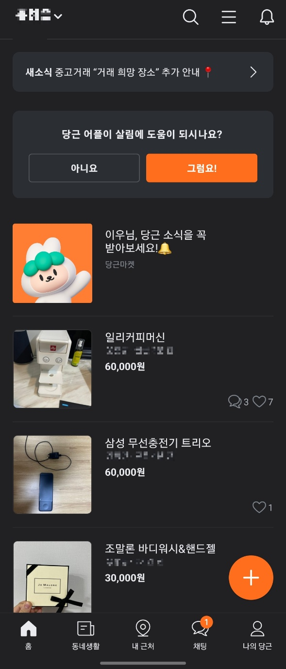 회원가입과 동네인증을 하면, 첫화면에 이렇게 나올 것입니다.