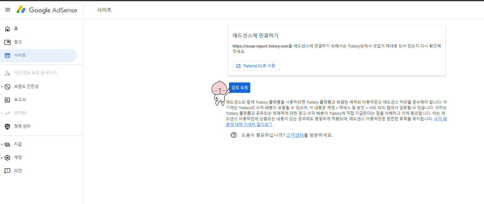 시작하기 버튼을 누르면 이 페이지가 나옵니다. 여기서 검토요청을 눌러주면 끝입니다.