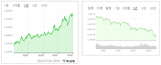이게 각각 1년 동안의 그래프입니다. 왼쪽께 환율, 오른쪽께 코스피입니다. 환율은 계속 올라가는데 코스피는 계속 줄어가는게 보이시나요? 3년 10년 데이터를 봐도 똑같을 것입니다. 이렇듯 환율이 계속 높아지면 코스피가 계속 줄어들 것이죠.
